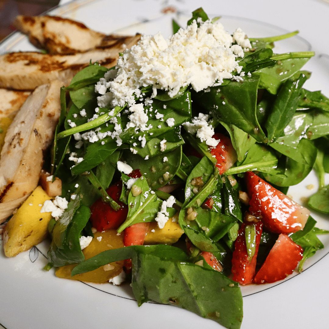 Spinach, strawberry, walnuts, mango, grilled chicken, feta, olive oil vinaigrette (VEG)